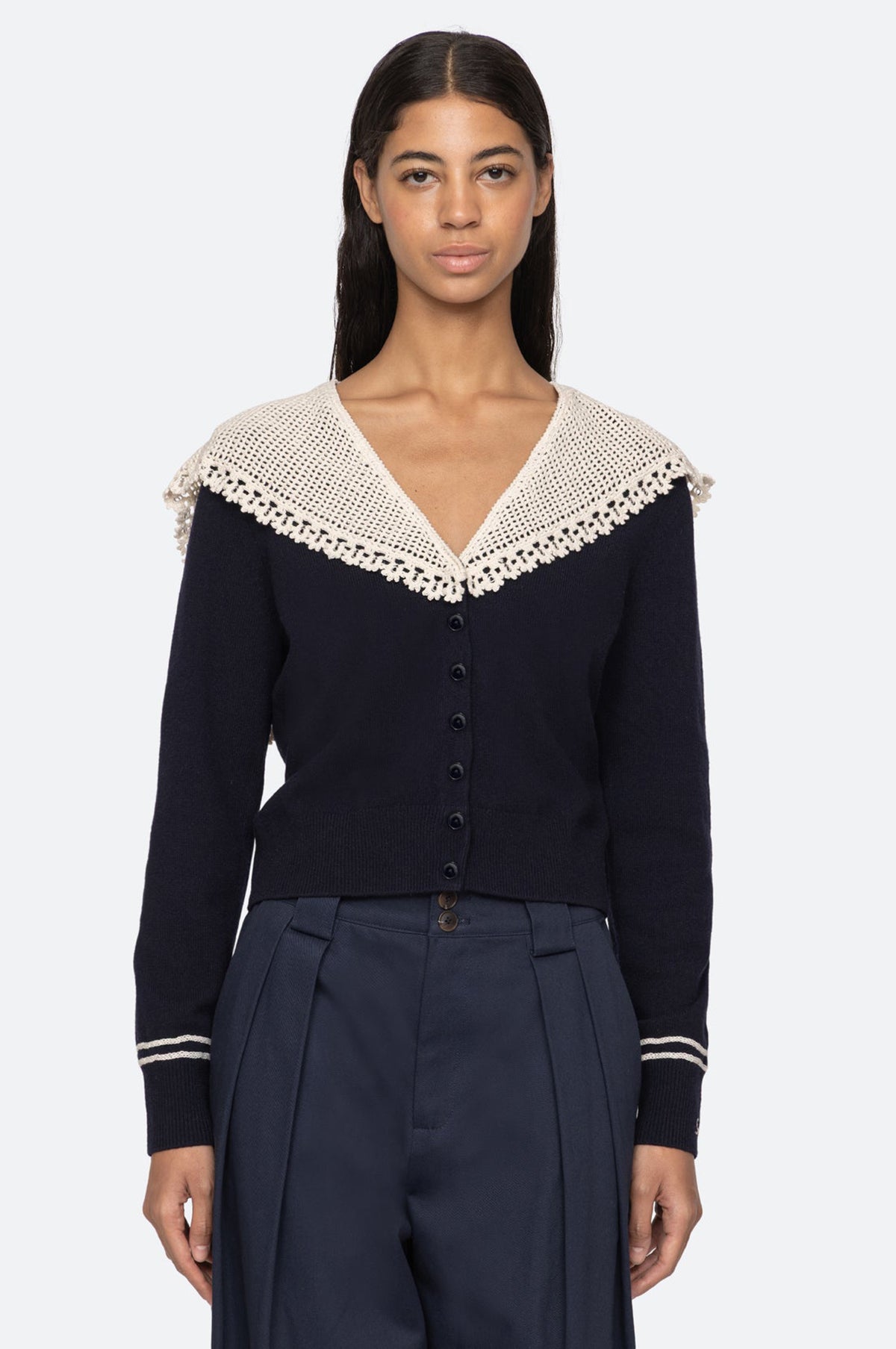 We never thought we'd find ourselves wanting to channel Renoir's Sailor Boy - but then again we hadn't seen this cardigan from Sea, New York. In a rich shade of navy with a V-neckline, detailed crochet capelet and embroidered 'Sea' logo on the cuff, this extra special piece will add a feminine dash of Victorian naval elegance to any outfit. For a timeless outfit pair with dark jeans and your favourite loafers.