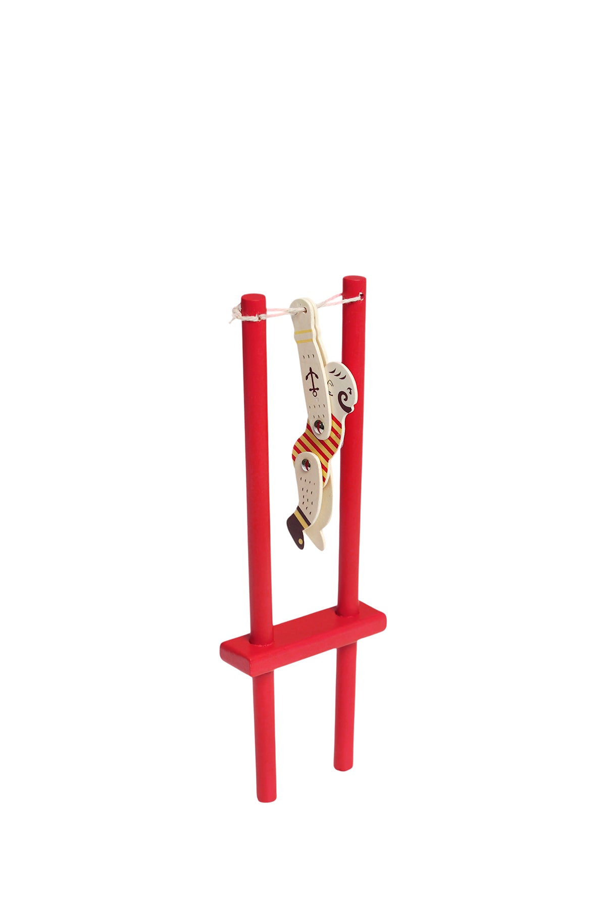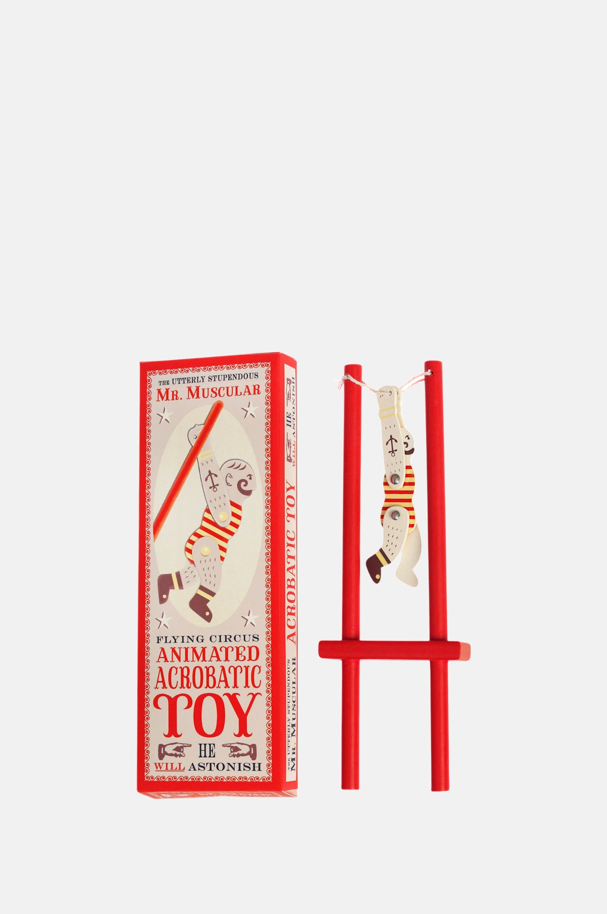 Much fun is to be had with the utterly stupendous Mr. Muscular wooden acrobatic trapeze toy. Simply squeeze the handle to make Mr. Muscular perform his fantastic feats.