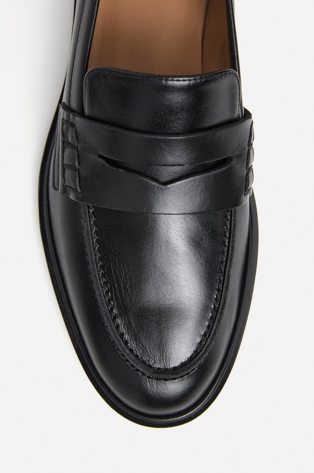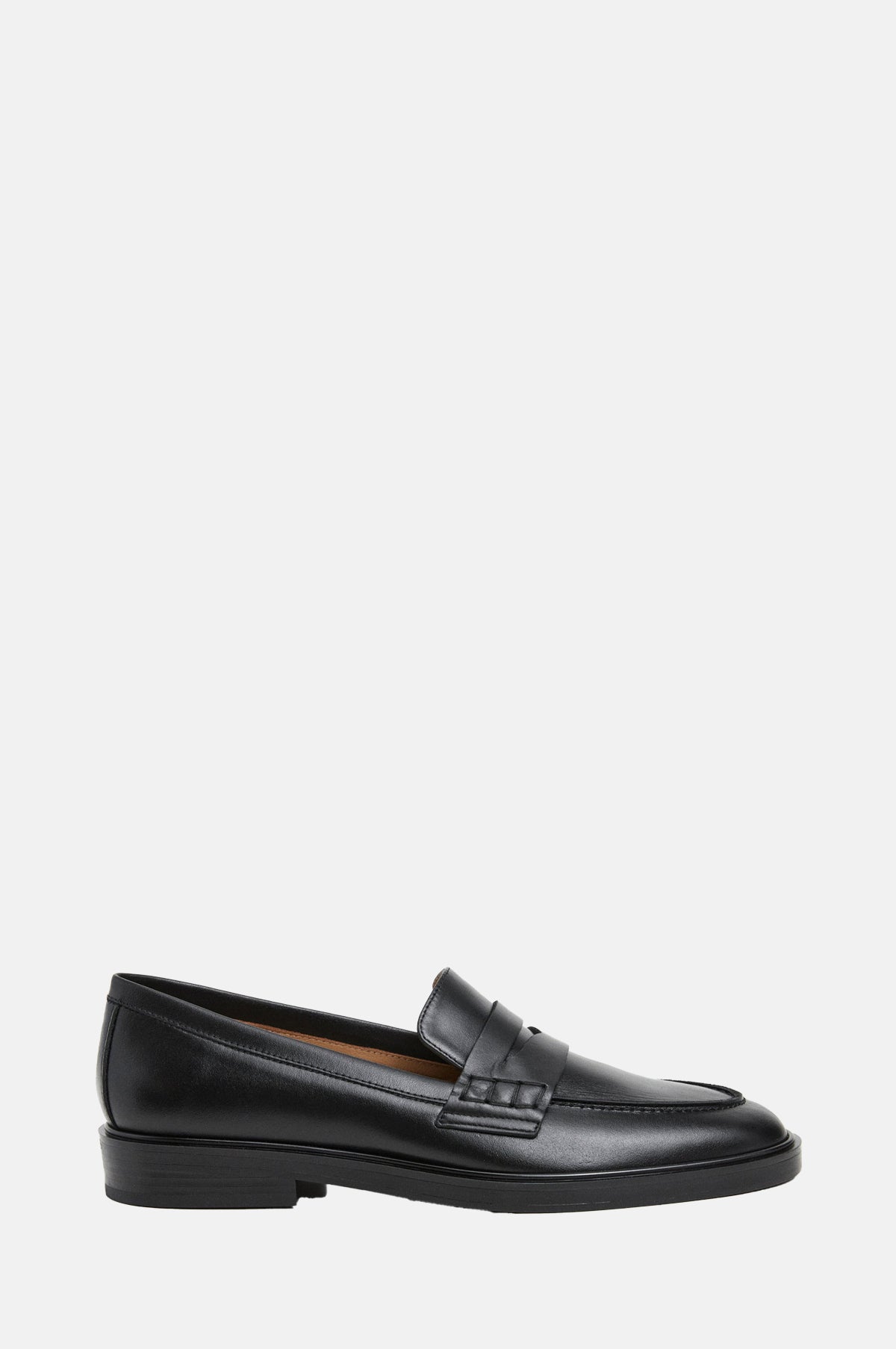 The Sara loafer in deep black takes the sensibilities of the classic penny loafer design and is reimagined with Scandinavian simplicity. A study yet refined shoe with an almond toe, flat heel, saddle strap and stitching around the vamp.