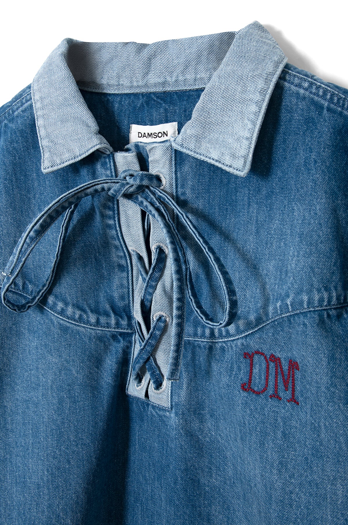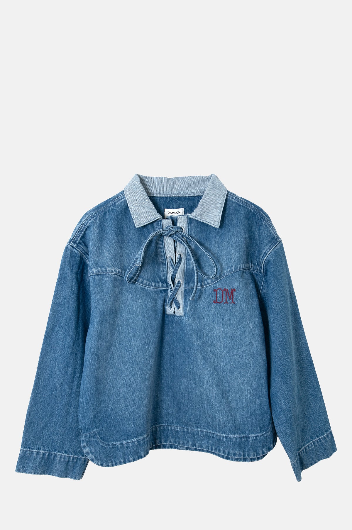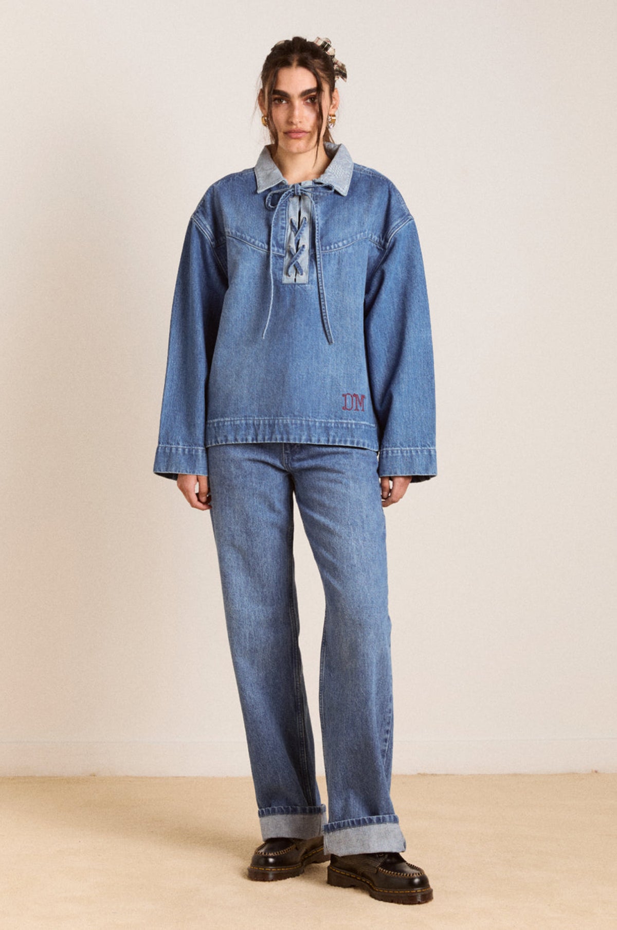 A fresh take on the classic rugby jersey, meet The Scarlett Rugby Shirt in bayou wash. Crafted from a blend of organic and recycled cotton, the Scarlett offers a wide sleeve profile with a contrast denim collar and lace up front detail. Finished with the signature DM embroidery detail in red. Pair with the matching Sylvie Jeans for a comfortable and easy throw on co-ord.