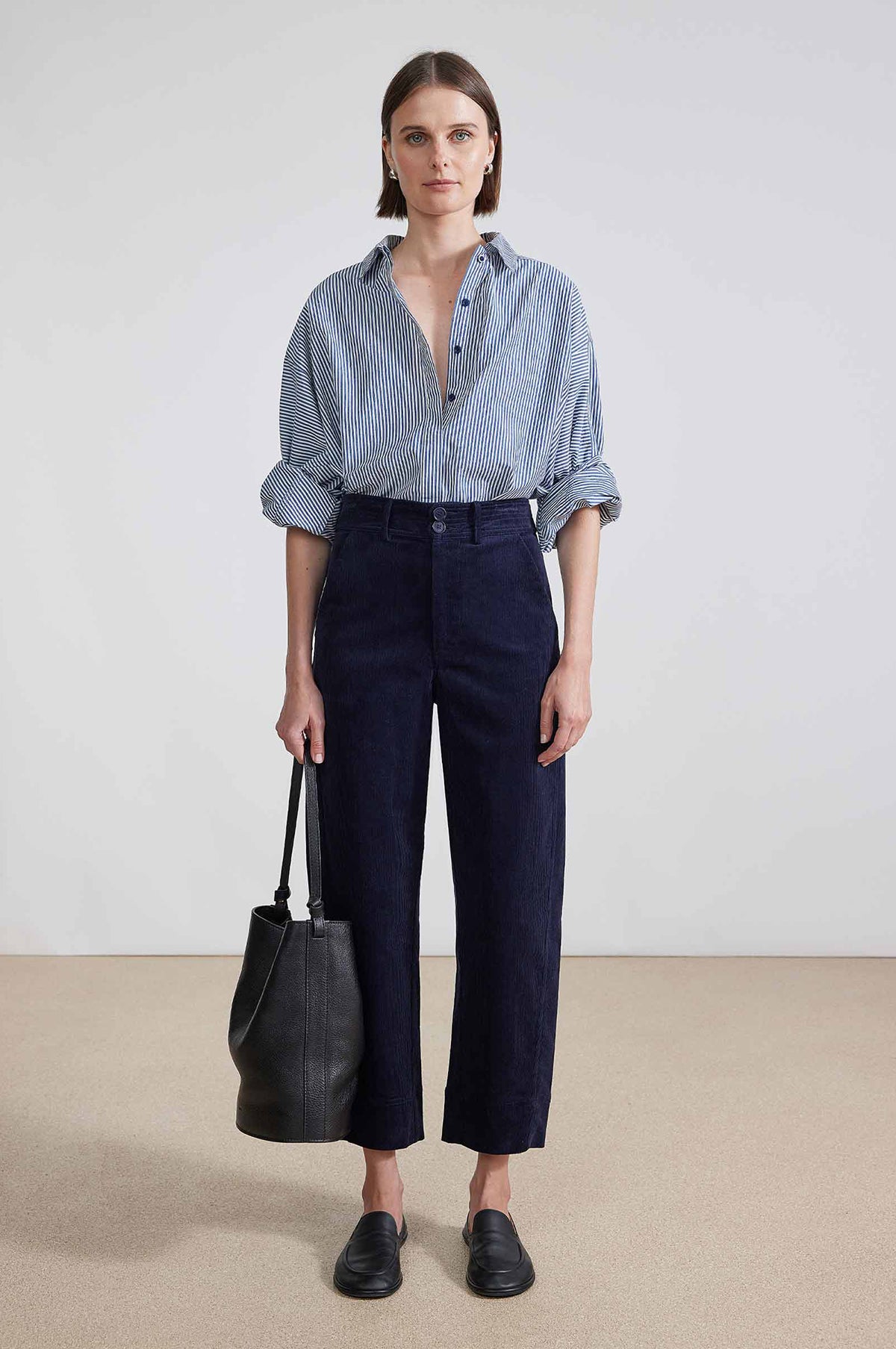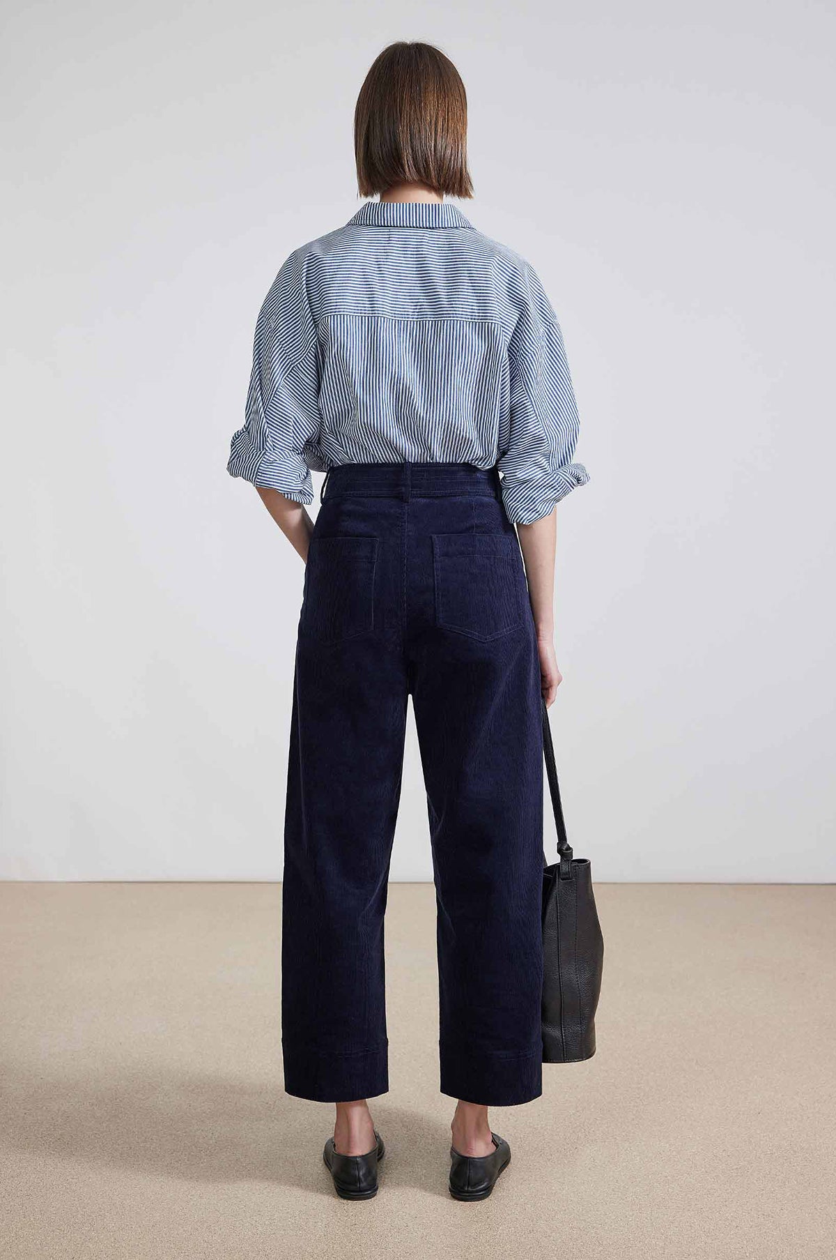 Crafted in a textured corduroy, the Marston pant is the perfect mix of retro cool with a modern twist. Designed for a slim fit, they're slightly cropped with a cute kick-flare finish and front patch pockets. We'll be dressing ours up for the office with a voluminous blouse and keeping them casual with our favourite tees for polished off-duty looks. Available in olive green and midnight blue.