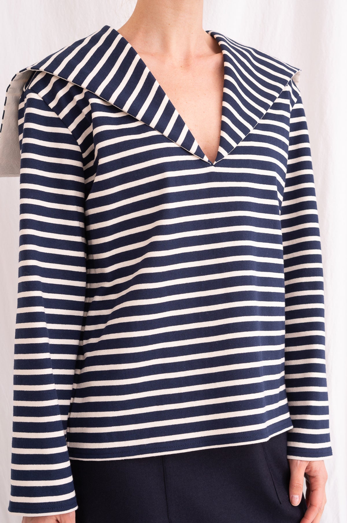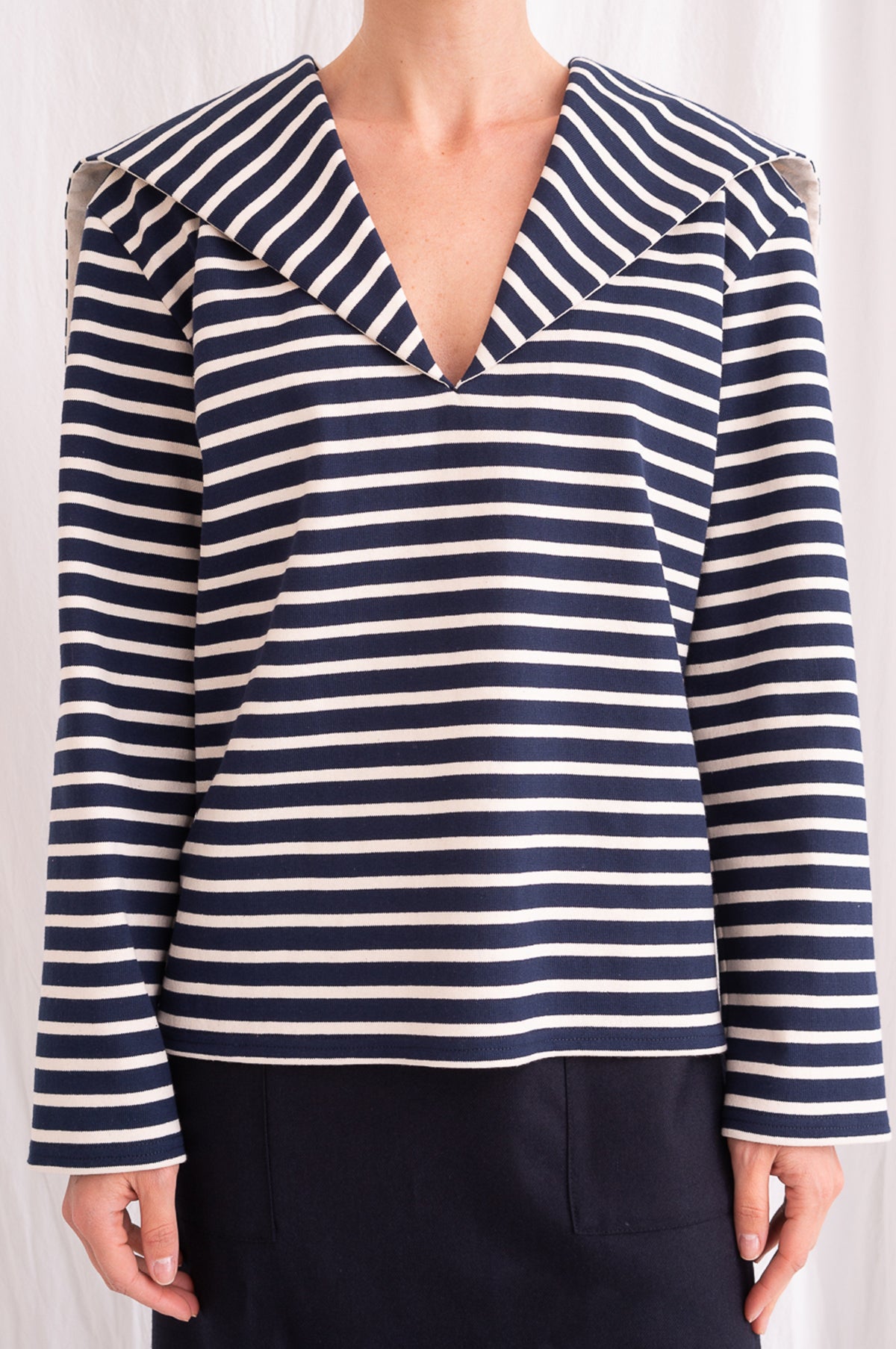 Playful yet refined, the Seaman Shirt is crafted from a heavyweight cotton. A statement sailor collar frames the top and provides a nod to the nautical which is echoed by its navy and cream stripe. With a vintage-feel and relaxed fit, this is a versatile piece that will pair well with anything.