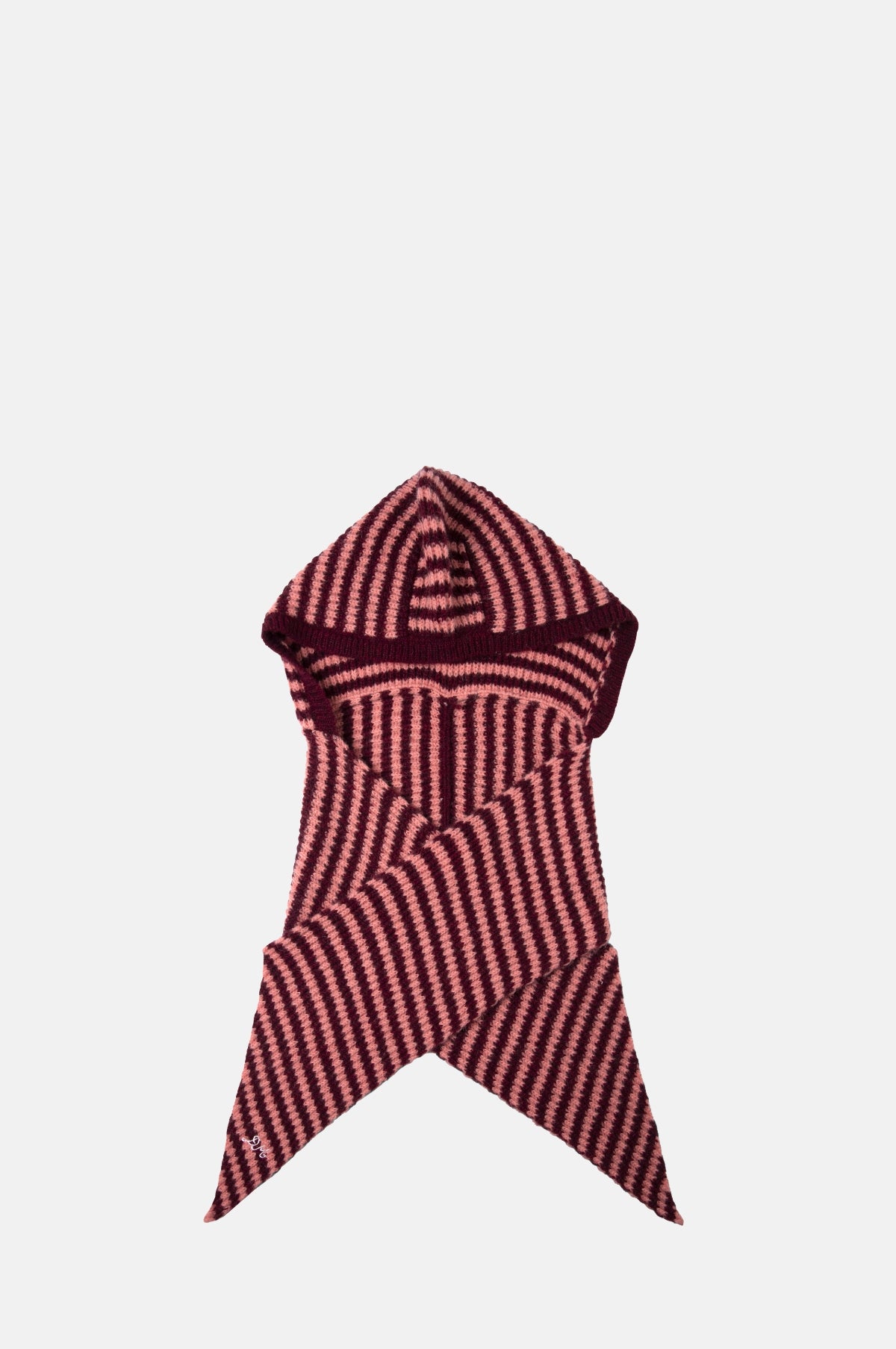 This knitted tie front hood provides a cheering remedy for our winter blues. Contrasting reds and pinks make up a playful stripe pattern and a standout red stripe lines the hood's opening. A versatile staple which can be worn in a variety of ways.